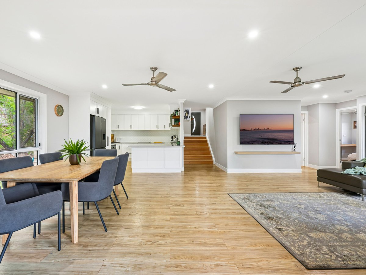 Step inside to a wide hallway featuring practical faux timber flooring and soft LED lighting, guiding you into a spacious open-plan living and dining domain. Bathed in natural light, this expansive area showcases seamless indoor-outdoor flow, enhanced by large windows and sliding glass doors that frame tranquil greenery. Air conditioning and dual ceiling fans ensure year-round comfort, while the neutral palette and warm timber tones create a calm, welcoming atmosphere ideal for both everyday living and entertaining.